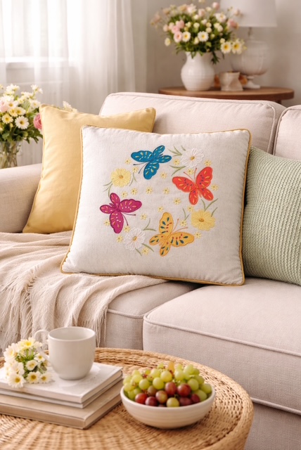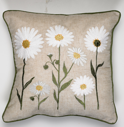 Add a fresh botanical accent to your space with the Blooming Daisy Natural Cushion. Featuring delicate embroidered daisies on a natural poly-linen blend fabric with coordinating trim, this cushion brings a light and timeless touch to any sofa, chair, or bed.